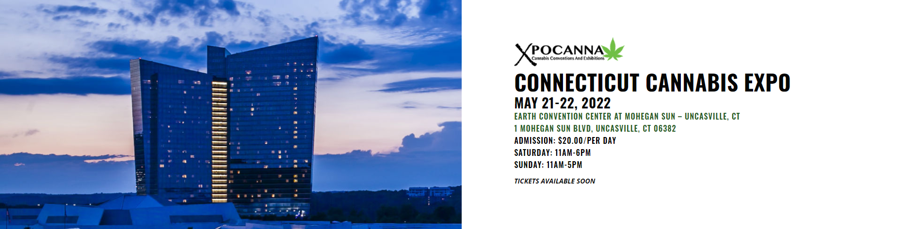 Presenting The Connecticut Cannabis Expo has been May 21-22, 2022 at the Earth Convention Center at The Mohegan Sun. Expo will run Saturday 11am-6pm and Sunday 11am-5pm. The Cannabis Expo features the entire Connecticut cannabis market and beyond. Participating companies will include dispensaries, prescribing doctors, growers, CBD companies, health professionals, advocacy groups, packaging, investment and job opportunities and much more!